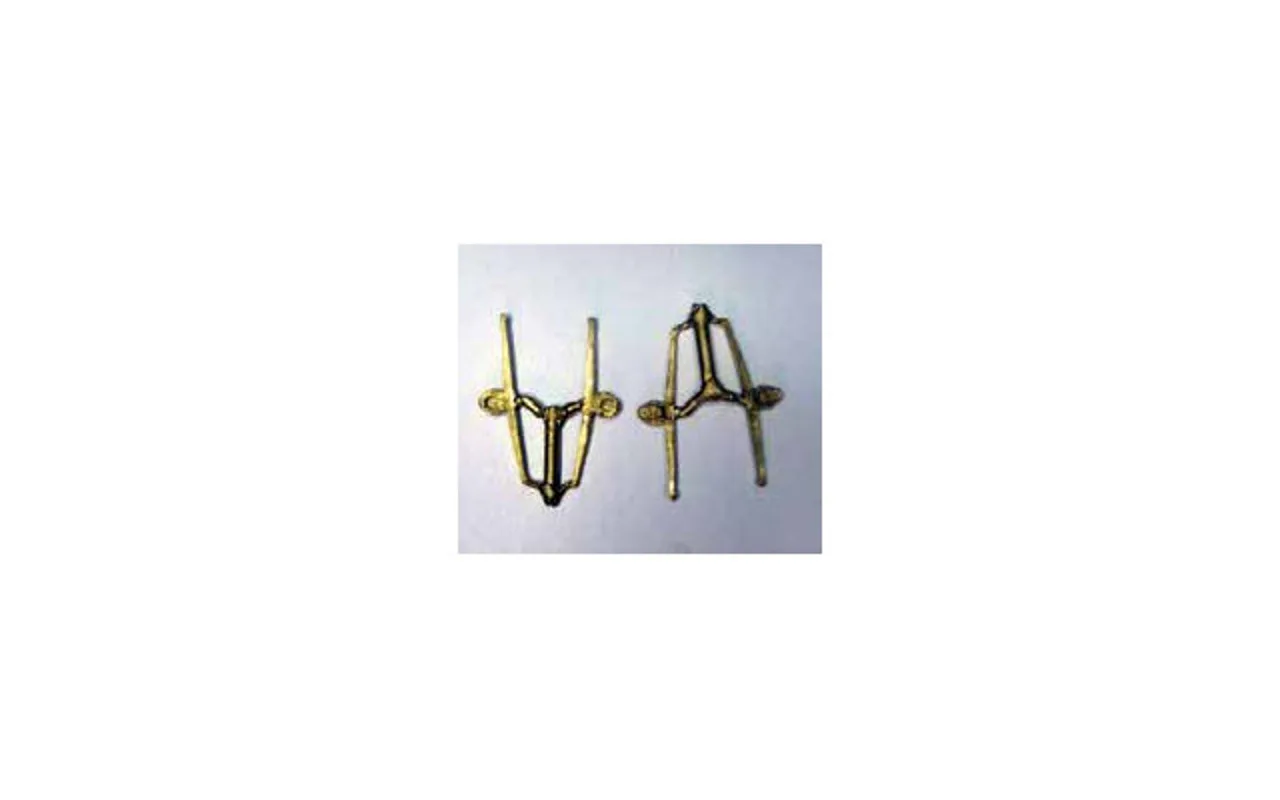 4mm Scale carriage springs in lost wax brass. The Stockton & Darlington Railway built a large number of coaches using these 7’ springs in the 1860’s and 70’s. They were used on 27’ 6” under frames for both 1st, 2nd and 3rd class coaches as well as smoking saloons, composites, 2nd brakes and clerestory brakes. The coaches were used on the Stainmore line and ran on the Cockermouth, Keswick and Penrith Railway. The coaches were taken over by the North Eastern Railway and at least one survives at Beamish Museum. The springs were also standard on coaches of lots of other railways of the time, including those that ran in Cumbria, so there is scope for lots of applications.To make use of the springs modellers will also need the Saddle Ends, which are available from Prickley Pear Products.